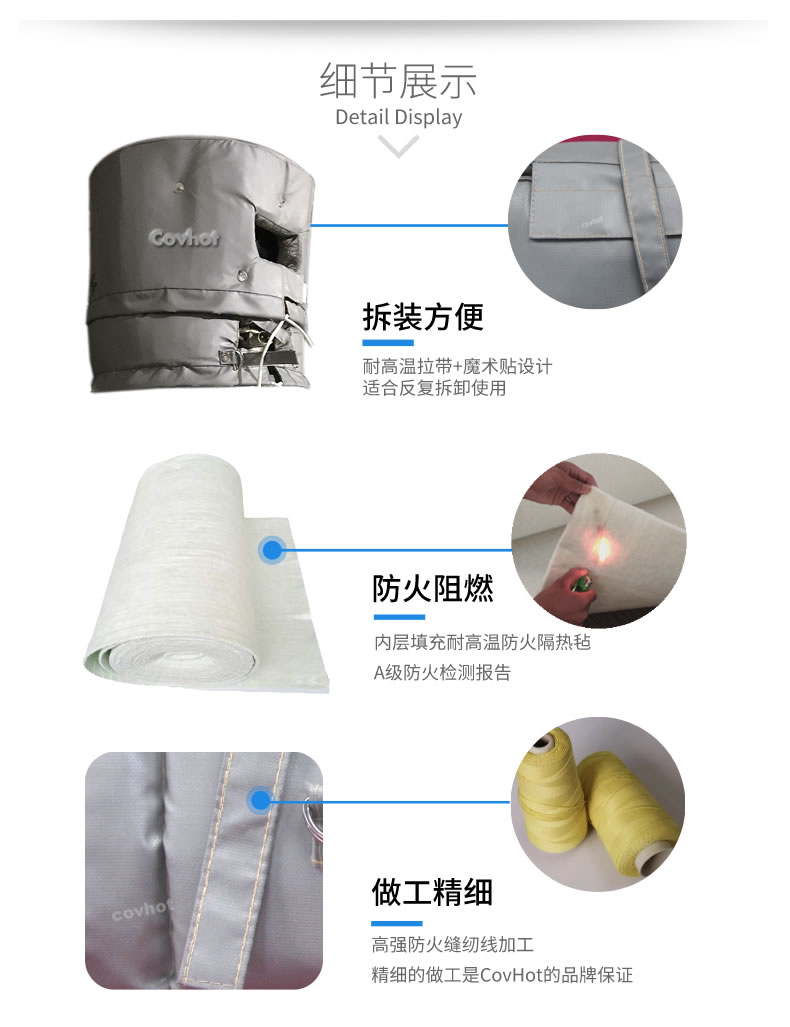 科好特covhot柔性可拆卸可拆卸擠出機(jī)保溫套按照用戶需要設(shè)計(jì)制作而成。安裝可拆卸保溫套后,可以讓設(shè)備表面溫度可降到40℃左右,觸摸不燙手。具有隔熱﹑防火防水、防油污、不腐化、耐腐蝕、表面可擦洗、強(qiáng)度大、易彎曲,深受廣大擠出機(jī)設(shè)備用戶喜愛(ài)。