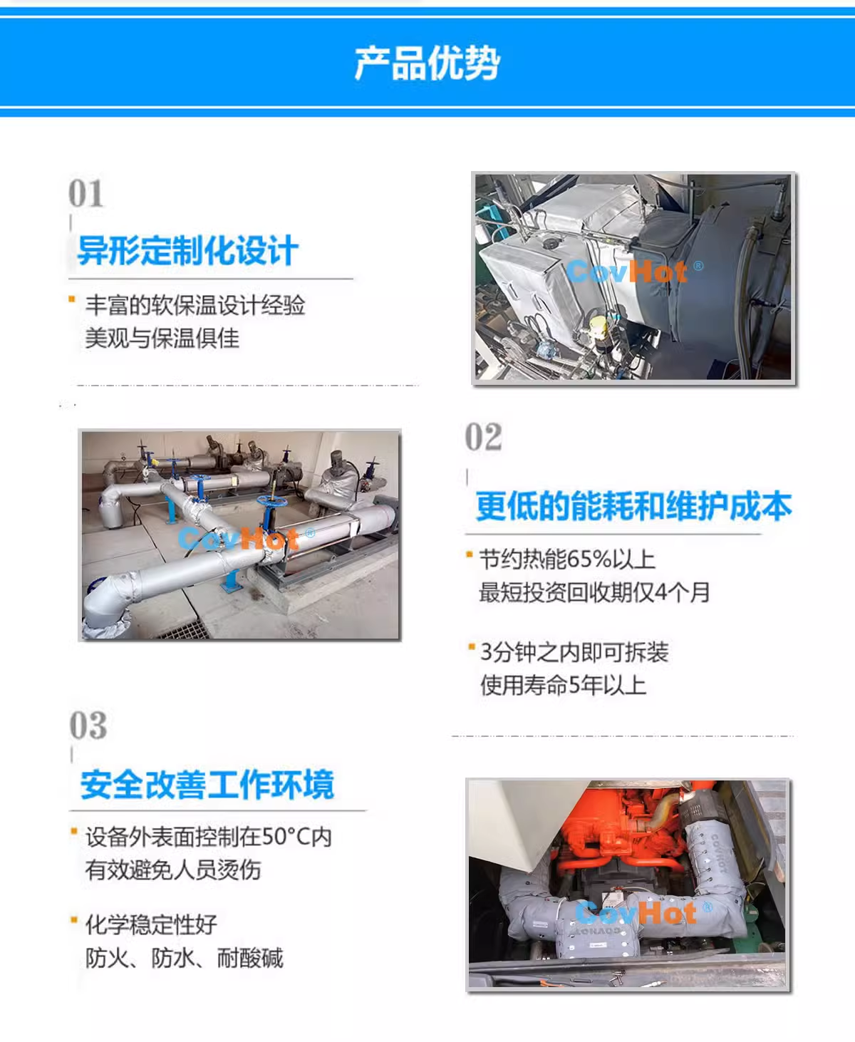 3. 維護(hù)的便利性,如果閥門需要維修或者拆裝,普通巖棉保溫拆除后無法二次利用,柔性可拆卸閥門保溫套可以循環(huán)使用。